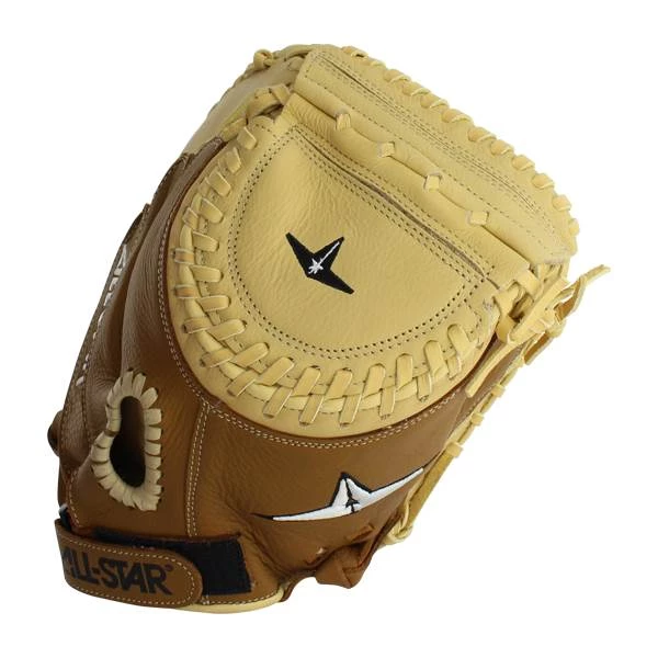 This All Star Pro Fastpitch Catcher’s Mitt (CMW2511) has a 33.50-inch opening, a one-piece closed web, a closed back, and a velcro strap for a custom feel. Its striking saddle and cream color looks great against your team uniform. Order your own All-Star Pro fastpitch glove today from JustBallGloves.com and enjoy free shipping. Don’t forget, with our expert customer service, we’ll be here for you from click to catch!